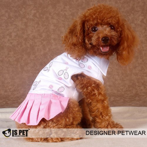 Is Pet Designer, Show off your dog's active personality with this Ivona Tennis Skirt. Cute little tennis racket embroideries on white collared tank with matching pink folding skirt at the bottom. This one piece is made for comfort, style and will stay put.